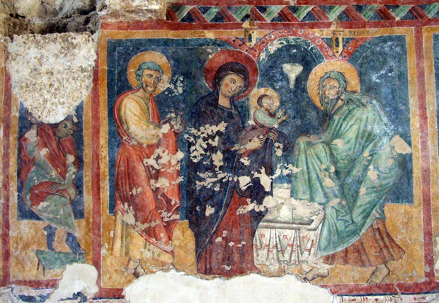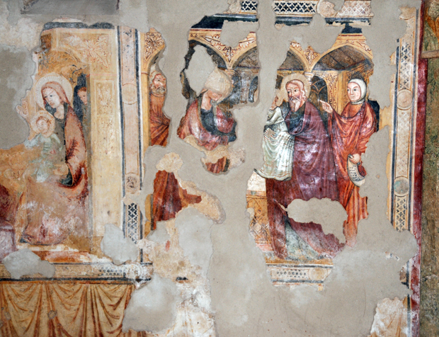 Nel presbiterio poco rimane della grande immagine della Madonna seduta, mutilata nella parte superiore. Meglio conservati i due frammenti di un ciclo di pitture che apparivano sulle pareti del coro. Si tratta della ripetizione di scene già rappresentate nell’aula rupestre, ma che in questo caso assumono una diversa funzione narrativa. Secondo il Cellucci questi affreschi non dovrebbero essere anteriori al 1513 in quanto all’esterno dell’edificio, nella parte alta, egli notava una pietra con tale data che attesterebbe l’epoca di edificazione del coro. Indubbiamente al 1513 deve riferirsi l’esecuzione di lavori alla chiesa di S. Maria, ma il fatto che la data sia posta quasi al limite del cornicione potrebbe far intendere che si sia trattato solo di rifacimenti parziali, quando gli affreschi erano stati già eseguiti, probabilmente nel XV secolo. Impropriamente lo stesso Cellucci (ma le condizioni delle pitture erano peggiori di quelle attuali) riconosce nelle due rappresentazioni un’Adorazione dei Magi ed una Sacra Famiglia. In realtà nella prima potrebbe trattarsi anche dei Magi oppure dei Pastori alla capanna, per la presenza di numerosi personaggi popolari, soprattutto donne, ma sicuramente si tratta di una Presentazione al Tempio nella seconda. Vi si riconoscono, infatti, tutti gli elementi che costantemente appaiono in tale scena: S. Giuseppe, sulla sinistra, di cui rimane solo il capo e parte della tunica, trattiene le due tortorelle della narrazione evangelica. La Madonna con le mani tese, coperta da un largo mantello, si rivolge al Bambino; questi è tenuto nelle braccia da S. Simeone, il cui aspetto non è irsuto come quello delle pitture della parete rupestre. Infine sulla destra l’immagine della profetessa Anna con la mano destra protesa verso il bambino e con quella sinistra che regge un cartiglio aperto. Pur se l’esecuzione rivela una capacita pittorica decisamente inferiore, come qualità, a quella degli altri affreschi, tuttavia vi si riconosce una spazialità architettonica conferita da una notevole profondità prospettica. Una doppia serie di archetti, che tagliano longitudinalmente la scena, si conclude sullo sfondo con un ambiente coperto da una volta a crociera che si richiama chiaramente alla crociera del presbiterio della chiesa in cui sono stati eseguiti.