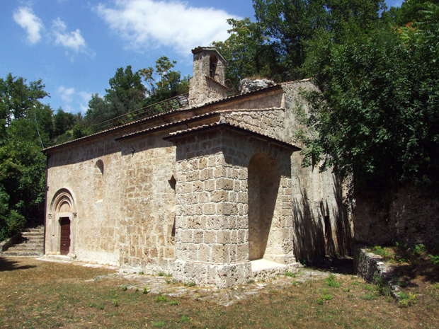 Non appena superato il prezioso portale non si può non rimanere suggestionati dalla particolare articolazione spaziale dell’interno che si dilata in un’aula principale caratterizzata da una pianta ad assi ortogonali, per naturale conseguenza della conformazione del sito. Un asse trasversale, regolarizzato da una serie di interventi architettonici succedutisi dal XIII al XIV secolo, costituisce la direttrice della navata principale che si stende parallelamente alla parete rocciosa cui è aggregato l’intero complesso. Un asse longitudinale, invece, individua uno spazio che apparentemente è una dilatazione naturale realizzata per guadagnare superficie per i fedeli, ma che in realtà è una vera e propria direttrice visiva verso la parte recondita della chiesa dove si sviluppa un ambiente addossato a quella parete di travertino che ne costituisce non solo la limitazione ma anche l’origine. A conclusione di questo secondo asse si apre una cavità naturale (che potrebbe essere considerata la parte terminale dell’originario e più antico impianto della chiesa) successivamente modificata e regolarizzata in coincidenza dei grandi ampliamenti del basso medioevo, quando la piccola grotta fu adattata a luogo di sepoltura, come lascia chiaramente intuire la pregevole arca in forma gotica che ancora sopravvive.