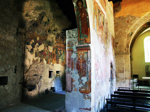 Certamente non furono di un solo autore, né furono eseguiti nella stessa epoca gli affreschi che, annullando le pareti interne della chiesa, ancora esaltano quei significati religiosi che secoli di abbandono e sciagurati interventi manutentivi avevano nascosto a tutti. La iconografia permette una distinzione dei cicli pittorici che possiamo dividere in tre gruppi principali. Gli affreschi rupestri e murali nell’aula piccola con scene della vita di Cristo; quelli dell’aula principale con le rappresentazioni dei Santi; quelli del Presbiterio e della cappella laterale con le rappresentazioni della Madonna.