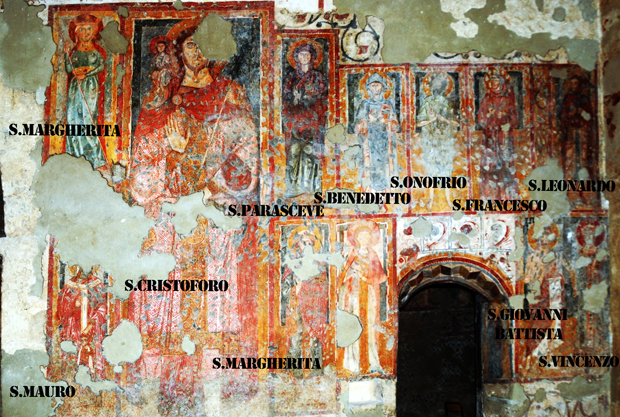 Verso destra è posta invece una serie di santi monaci. Il primo è inequivocabilmente S. Benedetto, rappresentato in atteggiamento benedicente e con la Regola nella mano sinistra. Sulla cornice verticale, infatti, sopravvivono alcune lettere di un originario S. BENEDICTUS. Il capo, tipologicamente simile a quello già analizzato di S. Nicola, è coperto dalla cocolla dell’abito monastico. Immediatamente dopo è raffigurato S. Onofrio, ricoperto da un vestimento peloso sul quale si confondono una lunga barba ed una irsuta capigliatura. Totalmente scomparso il volto, mentre conservati rimangono le gambe e i piedi nudi. La venerazione per S. Onofrio fu diffusissima nell’area molisana tanto che la sua immagine appare spesso in chiese eremitiche o rupestri, come nel caso di S. Eramo ad Isernia. Ugualmente numerose le chiese dedicategli, tutte fuori dei centri abitati, come quelle di Agnone, Carpinone e Chiauci.