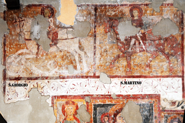 Nella parte più alta, immediatamente al disotto delle travi della copertura, in due grandi riquadri sono riprodotte le figure di due santi cavalieri, simili fra loro e senza alcun elemento particolare che ne garantisca l’identificazione. Fra i Santi che comunemente vengono cosi raffigurati vi sono Giorgio e Martino, che tra l’altro sono diffusamente venerati nell’area vulturnense. Vi si vedono rappresentati a cavallo, quello a sinistra bianco e quello a destra scuro, due soldati armati e con il capo aureolato.