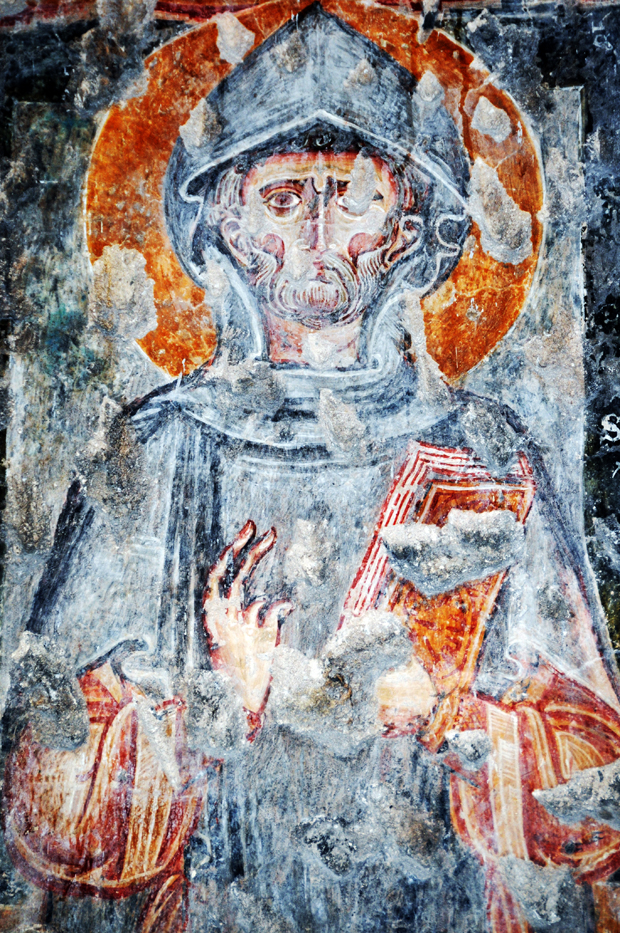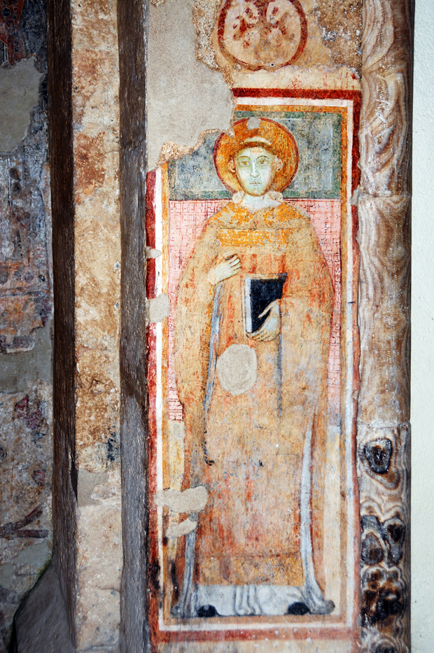 La mano di un altro artista realizzò, invece, il santo che appare sull’imposta dell’arco di separazione del presbiterio. Diversi dalle altre figurazioni risultano non solo la cornice rettilinea, ma anche il trattamento del panneggio che in questo caso perde la tendenza al geometrismo. Anche il volto senza barba, sebbene perfettamente ovale, perde la tagliente linearità degli altri e, pur rivelando una minore capacità artistica dell’autore, tuttavia fa ritenere più tarda, rispetto alle altre, l’esecuzione. La tonsura al capo e la dalmatica dorata, nonché il libro nella mano che rappresenta una Regola o la Dottrina, inducono a pensare che si tratti di un monaco importante. Potrebbe essere S. Gregorio Magno, il quale dopo aver fondato in gioventù vari monasteri, fra cui quello di S. Andrea al Celio dove a lungo visse, fu eletto Papa assumendo con le sue opere fondamentale importanza nella storia della dottrina cristiana. Ed è vestito da monaco, o al massimo da abate, che Gregorio veniva raffigurato nei più antichi codici miniati.