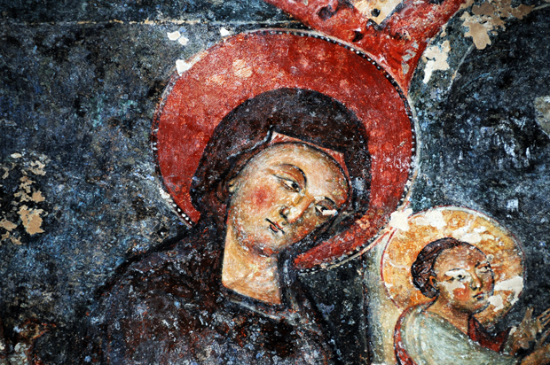 Alla destra del S. Cristoforo, su due file di riquadri appaiono altri santi, dei quali alcuni riconoscibili con certezza ed altri di difficile identificazione. Immediatamente a destra la figura femminile, più alta delle altre, dovrebbe essere piuttosto la Maddalena anziché la Madonna. Infatti oltre ad avere la mano destra aperta verso chi guarda, regge con la mano sinistra un cofanetto nel quale dovrebbero essere contenuti gli unguenti da utilizzare per la sepoltura del Cristo. Ricercato il panneggio del mantello rosso che, sul capo, ci ricorda quello della Madonna nei mosaici di S. Marco a Venezia. Anche in questo caso evidente è il riferimento alla iconografia orientale, non solo nelle circolari gote rosse che si stagliano sulla geometrica rotondità del viso, ma anche nelle decorazioni puntiformi del cofanetto.