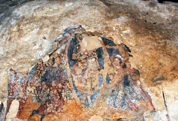 Questo ambiente, in origine, doveva essere di notevole ricchezza pittorica essendo quasi interamente affrescato da un ciclo dedicato alla sepoltura del Cristo. Ciò che rimane nella parete di destra ne è diretta conferma. Vi si scorge, verso l’apertura, una figura di donna in piedi che regge una ampolla per unguenti e che certamente rappresenta la Maddalena o una delle Pie Donne. Più a sinistra l’immagine di S. Giovanni presso il sepolcro. La penombra generale non solo accentua la suggestione della narrazione, ma esalta altresì la funzione sacra, e nello stesso tempo misteriosa, di questa grotta che rappresenta sicuramente l’origine di tutto il complesso di S. Maria.