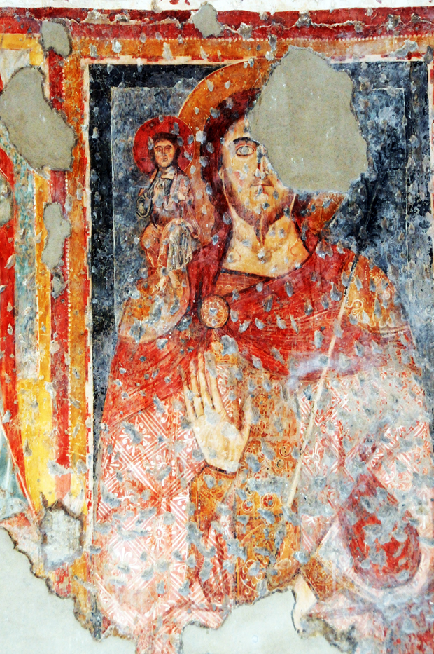 Sulla parte bassa della fascia interna all’arco, ben conservata è la figura di un S. Nicola vescovo di Mira, molto venerato nel meridione italiano, la cui perfezione esecutiva del viso pare abbia costituito un freno alla violenta opera di spicconatura della parete allorché fu ricoperto di nuovo intonaco. Il Santo è rappresentato con i paramenti sacri. Il volto, che in qualche modo per i caratteri somatici ci ricorda quello musivo del S. Nicola della basilica di S. Marco a Venezia, è di ottima fattura. La concretezza dei lineamenti ben definiti geometricamente, pur determinando anche in questo caso una fissa espressività, tuttavia rivela la conoscenza di quelle raffigurazioni che ormai, nel Trecento, erano ampiamente adottate dalle correnti pittoriche romane e napoletane. Di grande effetto l’incorniciatura dell’aureola, modulo base della costruzione geometrica, che con il proprio rilievo scanalato conferisce alla figura un senso di profondità, accentuato da sapienti effetti chiaroscurali sia nel volto che nella mitra poggiante sul capo. Dall’ampia casula rossa con il tau dorato e segnato da tre croci sui tre bracci, appare da una parte la mano destra benedicente e dall’altra la mano sinistra che regge un sottile pastorale latino mentre, nello stesso momento, tira per i capelli, sollevandolo, un fanciullo che mantiene una coppa. Nel basso i piedi, che calzano pantofole di raso rosso, fuoriescono appena dal camice bianco. Per quanto riguarda l’interpretazione iconografica bisogna notare che la raffigurazione si discosta dalle tipiche scene della vita del santo. Infatti generalmente egli veniva rappresentato con i tre fanciulli resuscitati dopo che un oste li aveva fatti a pezzi e messi in salamoia, oppure con le tre monete d’oro che donò come dote a tre giovani fanciulle. Nel nostro caso, considerando l’analogia compositiva con il laterale S. Mauro, deve trattarsi di un salvataggio dall’acqua. Questo miracolo fu molto rappresentato soprattutto in oriente ed in particolare vari esempi si ritrovano in icone russe del XIII secolo, quale quella di S. Nicola che libera Demetrio dal fondo del mare, del XIV secolo, quale quella di S. Nicola che salva un uomo che sta per annegare (ambedue alla Galleria Tret’jakov di Mosca) (15).