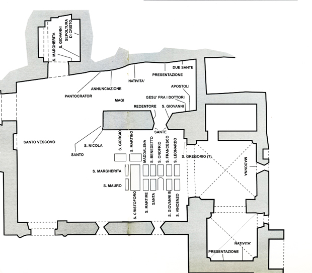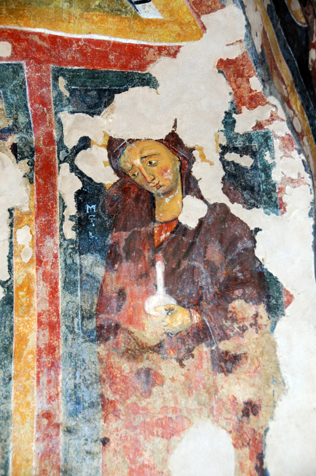 Da quanto descritto possiamo avere solo un’idea della quantità di pitture che si susseguivano sulle pareti della chiesa e dai brandelli di esse che compaiono in ogni parte si desume che tutto l’edificio fosse, nel XIV secolo, affrescato. Tracce consistenti si ritrovano anche nella buia cappella rupestre in cui è situata l’arca funeraria gotica. Un piccolo reperto mostra i segni di una decorazione con panneggio ornato di rombi, identico per esecuzione e forme a quello che appare ai piedi degli apostoli, confermando così che fu la medesima mano ad eseguire queste pitture. Nella stessa cavità, rettificata in forme architettoniche trecentesche mediante uno scavo interno, appare una santa martire che regge con la mano destra una croce e con la sinistra una corona con diademi. L’epigrafe verticale che ancora vi si riconosce, SCA MARG(a)RITA, ci rivela che si tratta di S. Margherita.