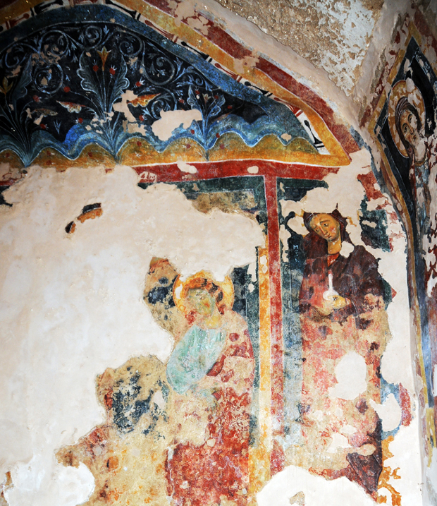 Nelle spallette dell’intradosso doppiamente strombate, della piccola apertura che collega le due aule, sono poste quattro figure, una per parte, di cui meglio conservate sono quelle verso l’interno e praticamente illeggibili le altre due. A destra si riconosce un Cristo, con aureola crociata colore oro, che benedicendo regge un libro con la sinistra. Sull’altro sguincio dovrebbe trattarsi di un S. Giovanni Evangelista rappresentato con tunica verde, mantello rosso e calzari ai piedi.