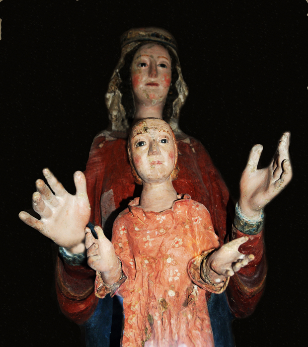 La santa a destra ha, invece, una tunica marrone e mantello quasi nero. Con la mano destra regge una Croce e con la sinistra un libro chiuso con brossura in rosso. Anche se non appare il giglio potrebbe trattarsi di Santa Chiara la cui beatificazione avvenne nel 1255 in Anagni e la cui venerazione rapidamente si diffuse insieme a quella di S. Francesco. Ne potrebbe essere conferma non solo il colore della tunica, ma anche la presenza della Croce in una mano e del libro della Regola nell’altra, secondo una iconografia abbastanza in uso fino al XV secolo.