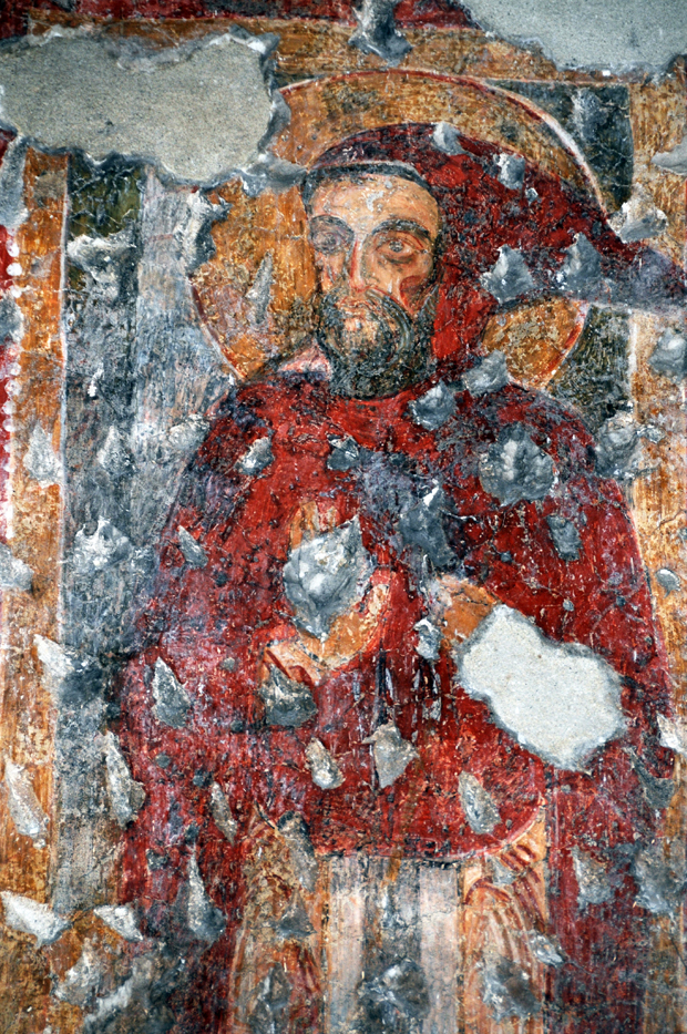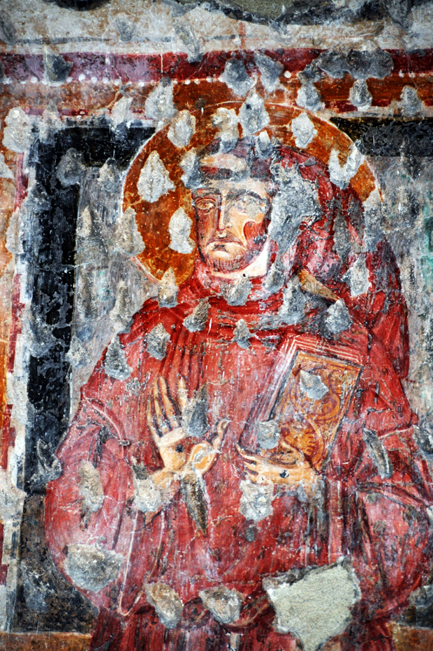 Al disopra del S. Nicola, sempre sulla fascia interna dell’arco, una raffinata raffigurazione di un santo dal volto senza barba. Un’aureola a rilievo con i raggi scanalati e contornata da una linea circolare rossa, inquadra il capo sul quale si sciolgono lunghi capelli biondi ondulati e simmetricamente divisi da una riga centrale. Una piccola bocca e l’accentuata inarcatura delle sopracciglia sugli occhi a mandorla evidenziano la fissa espressività del personaggio. Una lunga tunica verde è coperta da un mantello rosso asimmetricamente poggiato sulla spalla sinistra e abbottonato su quella destra, mentre un lembo di esso rigira sulla mano destra che regge una sottilissima asta con terminazione superiore a croce gigliata. La mano sinistra che fuoriesce dal mantello all’altezza dell’ombelico regge un voluminoso libro chiuso.