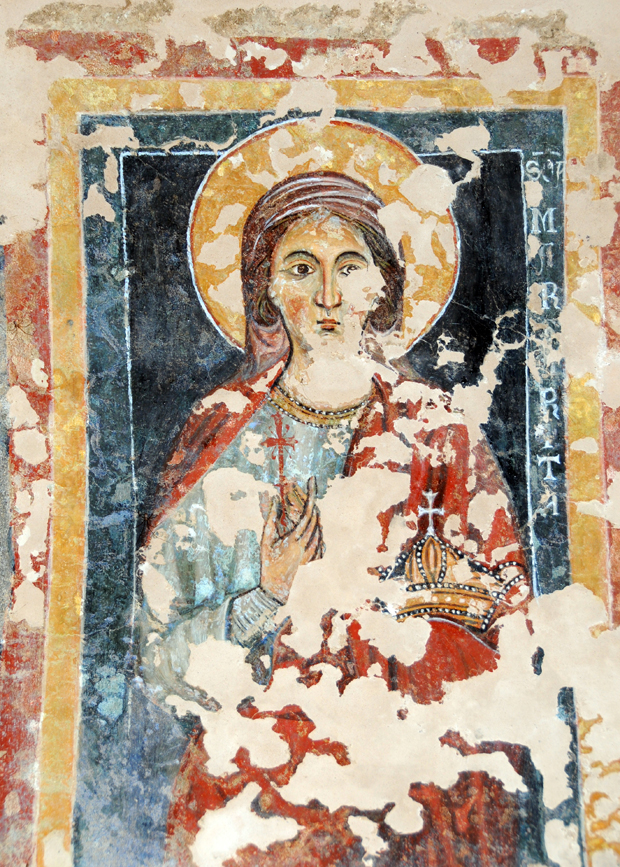 Sulla sinistra del S. Cristoforo, nella parte superiore, una Santa con la corona del martirio regge una lancia che taglia in diagonale il riquadro. L’affresco è molto rovinato in basso, ma è presumibile che vi fosse rappresentato un drago. Dovrebbe trattarsi di S. Margherita di Antiochia, molto nota e venerata nella zona e conosciuta per l’episodio del drago. Margherita, orfana di madre, fu allevata dalla nutrice nella fede cristiana. Mentre pascolava le pecore fu vista da Olibrio, governatore della provincia, il quale non potendola avere né come moglie, né come concubina, la condannò alle più disparate torture, attribuendo alla sua fede cristiana i motivi dell’ostinato rifiuto. Uno dei tormenti, amplificato dalla tradizione popolare, fu quello di rinchiuderla in una buia prigione dove le comparve il Demonio che, sotto forma di drago, circondato da orribili serpenti, la inghiottì. Ma ella con una croce che aveva in mano gli squarciò il ventre e riuscì a liberarsi, anche se poi, subite altre torture, fu costretta al martirio per decapitazione.