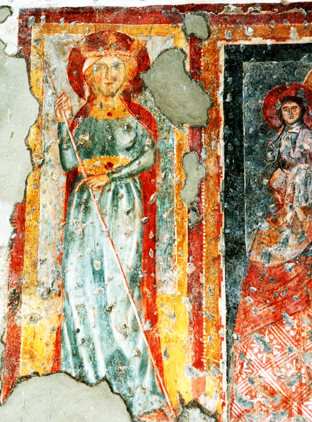 Nel registro inferiore la prima immagine dopo S. Cristoforo appartiene certamente ad una Santa regina. Lo rivela non solo la ricchezza delle vesti multicolori dove ornamenti puntiformi richiamano le pietre preziose e le volute filiformi alludono a ricami in oro, ma anche la corona posta sul capo. La mano sinistra sembra reggere una seconda corona, ma purtroppo le cattive condizioni della parete non permettono di affermarlo con certezza. A lato una seconda figura femminile con una tunica ed un mantello molto semplici. Anche in questo caso le pessime condizioni dell’affresco non consentono una identificazione precisa, anche per l’assenza di un qualsiasi elemento di riferimento agiografico.
