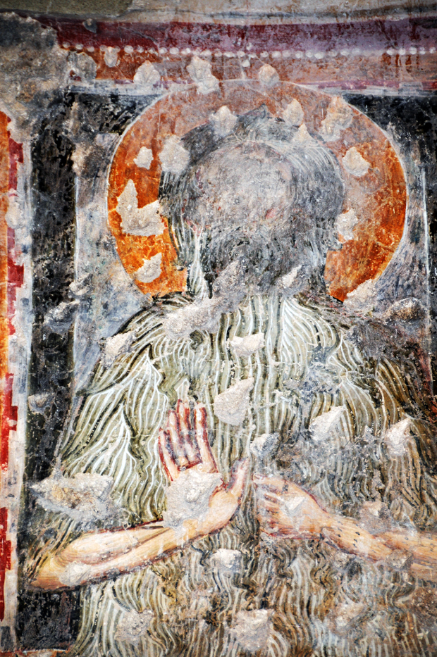 Infine nell’ultimo riquadro, l’ultimo personaggio, pur essendo in abiti monastici, non è un benedettino, né francescano. Il capo è coperto dal cappuccio, calato fino alla fronte, di un ampio capperone rosso. Il volto, smunto e con gli occhi molto tirati, è caratterizzato da un’ispida barba non lunga. Nella parte inferiore la tunica biancastra, con una panneggiatura a pieghe e contropieghe geometricamente richiamate all’altezza delle ginocchia, è solcata verticalmente da una sorta di stola che esce dal mantello.