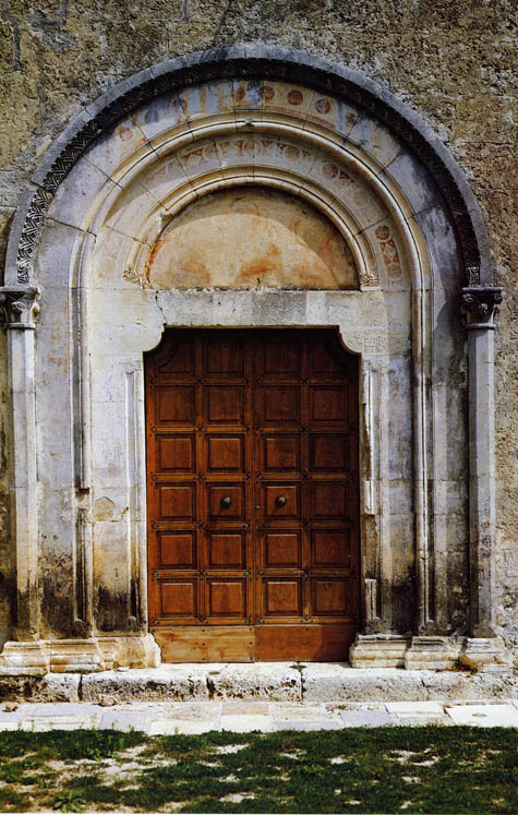 Per quanto riguarda il portale principale, che è sistemato sulla parete laterale a raccogliere il massimo della luminosità, bisogna riconoscere l’utilizzazione di uno schema compositivo di elevata raffinatezza pur nella semplicità complessiva. Nessuna importanza per la datazione deve essere data alla epigrafe posticcia che grossolanamente compare sulla mensola: M.C.D.A. – AD XXIII D.F. 1619 FV RIVOTATA ET BIANCHITA; infatti, essa è da riferirsi a quei lavori di rifacimento che nel XVII secolo danneggiarono e distrussero in gran parte il ciclo degli affreschi interni. E’ invece più importante considerare come la particolare composizione si discosti nettamente dal romanico-gotico abruzzese cui sovente, anche se a volte impropriamente, si fa riferimento per l’architettura molisana.