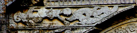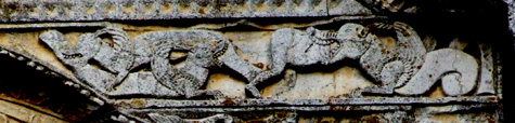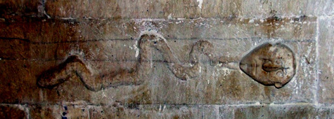 A dare sostegno al tutto intervengono i due serpenti che sono ritratti specularmente nell’intradosso della lunetta del portale centrale.