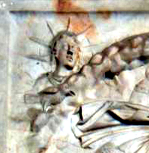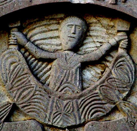 L’Angelo indirizza la benedizione alla sua destra direzionando la mano verso quelle figure che sono sistemate simmetricamente, dall’altra parte dell’arco, contornate allo stesso modo con una scanalatura ad andamento circolare quasi a voler evidenziare che nel contesto generale le due composizioni vanno messe in relazione.