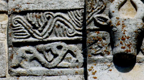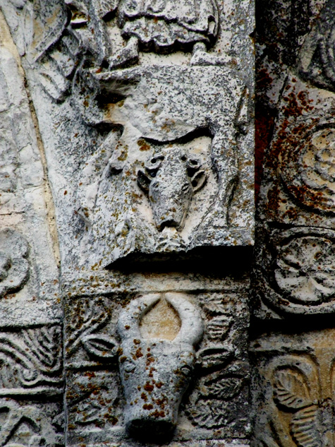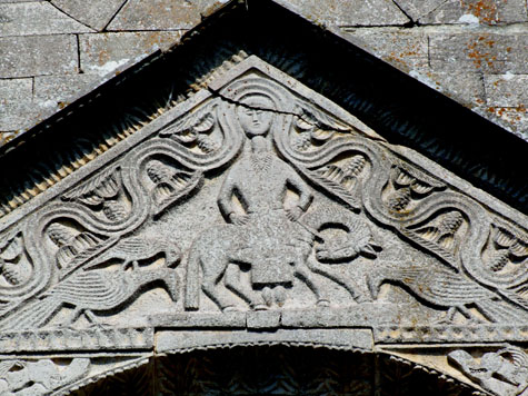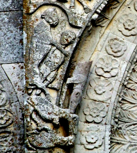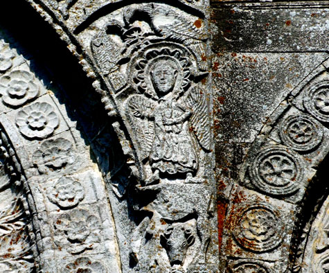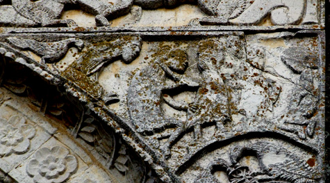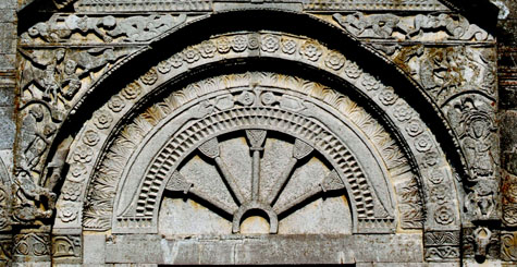 Nel nostro caso vi è una zona particolare della facciata in cui sembra concentrarsi una serie incredibile di significati simbolici che in qualche modo possono essere il punto di partenza di tutta la narrazione. Anzi, più che un punto di partenza, sembrano essere un punto di passaggio di una narrazione che non ha un inizio ed una fine, ma una sorta di circolarità senza fine. Quasi si tratti di uno di quegli intrecci viminei delle balaustre bizantine in cui le linee non hanno inizio e non hanno fine nell’evidente tentativo di geometrizzare il senso dell’infinito teologico.