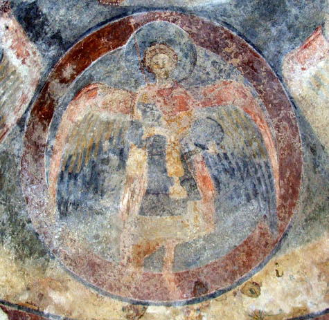 E’ una figura dotata di grandi ali aperte ritratta in posizione frontale con i piedi nudi divaricati e con la mano destra allungata nell’atteggiamento di giudicare-benedire alla greca unendo il pollice all’anulare. Sull’avambraccio è appoggiato un manipolo. Il braccio sinistro, invece, è appoggiato sul petto trattiene qualcosa. Sembra si tratti di due rotoli.