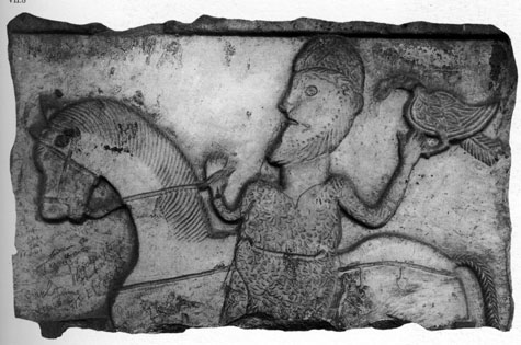 Il cavaliere, vestito di una tunichetta, ha il piede nelle staffa con la mano sinistra regge le redini del cavallo.