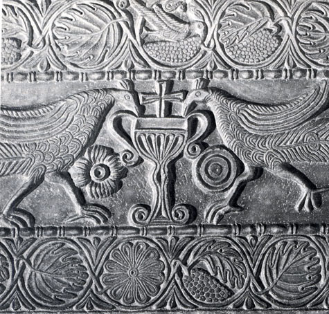 Ma la scena apparentemente misteriosa è quella che si trova alla destra, subito sopra i pavoni che si abbeverano al calice dell’Eucarestia.