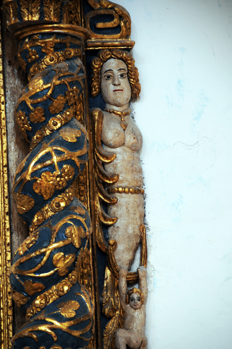 Femminili, invece, sono le forme delle sirene bicaudate dell’altare di S. Maria di Loreto a Carpinone. In questo caso le code vegetali risalgono verso l’alto per trasformarsi in tralci da cui pendono grappoli di uva. Le braccia fitomorfiche si uniscono sul capo coronato della sirena per racchiudere al suo interno la testa di uno pseudo-cherubino.