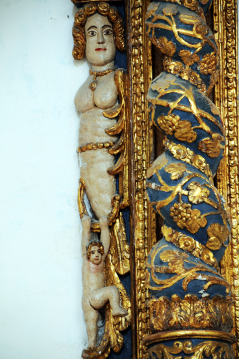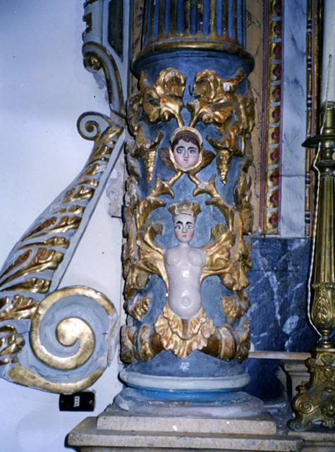 Certamente singolare è la presenza di altri esempi di figure femminili, completamente nude, che appaiono frequentemente negli altari lignei di Agnone. Non hanno la raffinatezza dell’altare di S. Crescenzo. Anzi appaiono piuttosto rozze. Quasi volutamente volgari. Si presentano con un volto grossolano arricchito da un colliere dorato con pendaglio e un filo di perle dorate all’altezza dell’ombelico.