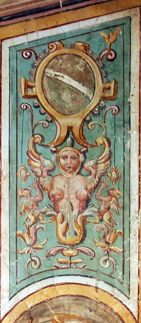 Mi ritrovo anch’io,sulla volta di un antico salone seicentesco,due sirene bicaudate ,nude,con i seni scoperti……,fogliame vario incornicia il tutto,……oltre a due elmi piumati …..: simboli storici di una famiglia pagana?,…..o…..simboli massonici di vetusta epoca??….Chi sa dirmi qualcosa?….Dimenticavo!…: l’ambiente ha una trifora in pietra cinque/seicentesca con colonne ottagonali………