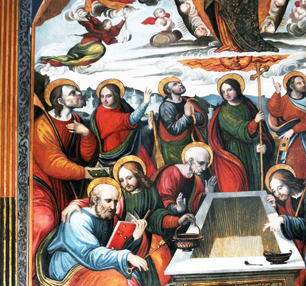 Per capire il senso della pittura dobbiamo necessariamente attingere al testo apocrifo detto delle Pseudo-Giovanni che descrive nei particolari cosa si accaduto al momento della morte della Madonna e racconta dell’episodio di Tommaso che riceve il sacro cingolo direttamente dalle mani della Madonna.