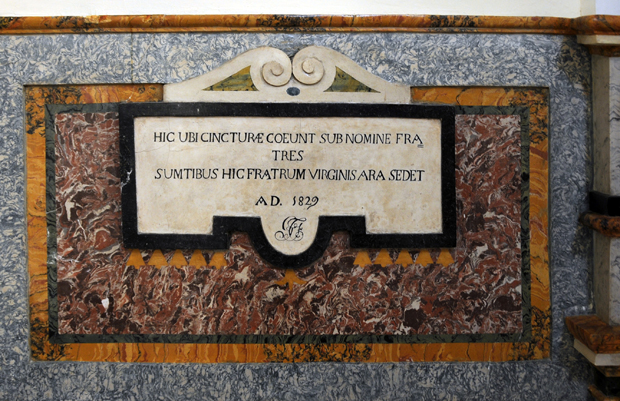 “Qui dove i confratelli si riuniscono sotto il nome della Cintura, qui l’altare della Vergine si regge a spese dei confratelli. Anno del Signore 1829”.
