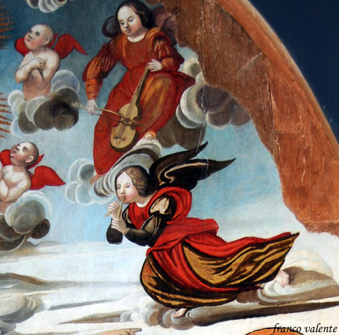 La scena è canonica. Nella parte alta (anche se l’immagine è quasi completamente scomparsa) è Maria Assunta in una mandorla di fuoco. Intorno a lei è disposta una cornice di nuvole con dieci testine di cherubini. Esternamente altri sei cherubini oranti escono da altrettante nuvolette. Accompagnano l’assunzione quattro arcangeli musicanti che suonano un violino, un flauto doppio, una mandola e un liuto.