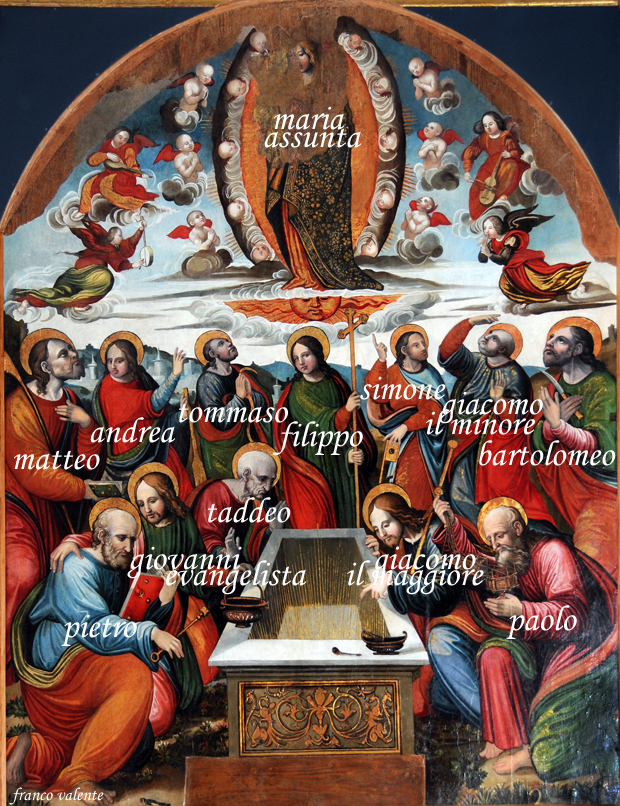 Interessa un particolare. Tra gli apostoli che osservano la Madonna che viene assunta in cielo ve ne è uno che regge con la mano destra alzata una cintura. Come se l’avesse appena ricevuta.