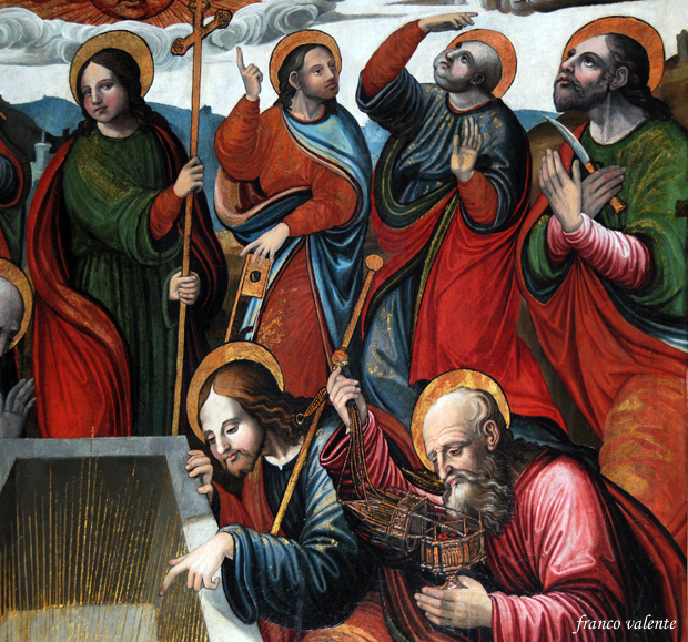 I sette apostoli in piedi dovrebbero essere in sequenza da sinistra Matteo che regge un libro che richiama il suo vangelo e, subito dopo, Andrea, fratello di Pietro, che regge un remo che ricorda il suo mestiere di pescatore.