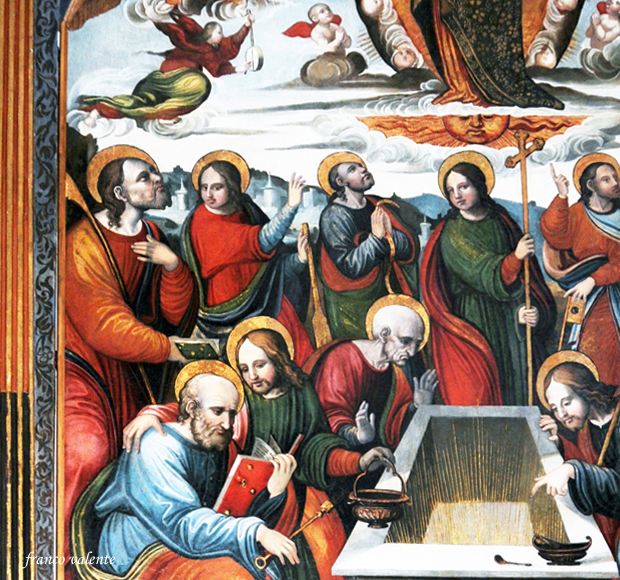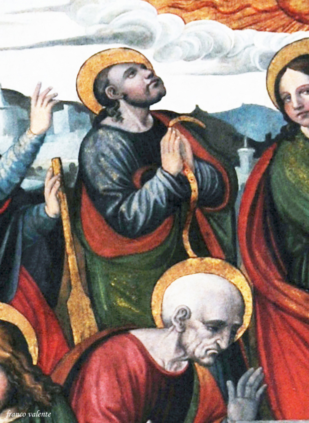 Altri apostoli, non tutti, si riconoscono per i loro attributi specifici o per deduzione. In primo piano l’apostolo anziano, stempiato e con i capelli bianchi, è inequivocabilmente Pietro. Sembra che abbia in mano una chiave, invece molto probabilmente è un aspersoio per la benedizione della salma. Lo fa capire la vicinanza con il secchiello tenuto dall’altro apostolo. Conseguentemente si può ritenere che simmetricamente sulla destra l’anziano personaggio che regge un incensiere è Paolo.