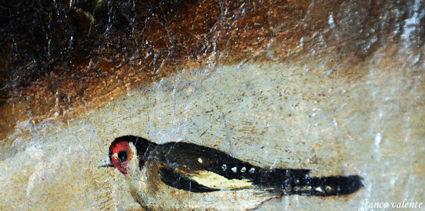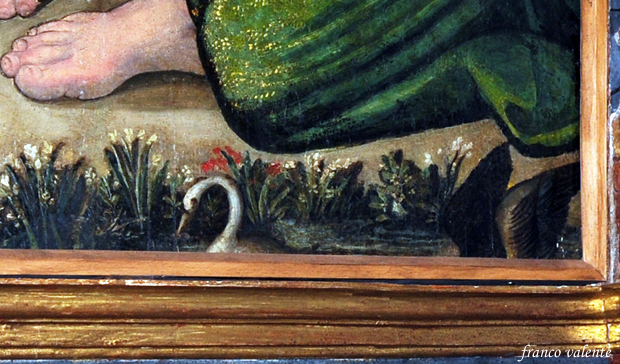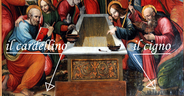 Ma due particolari apparentemente insignificanti sono meritevoli di attenzione. Sulla linea inferiore del quadro appaiono due uccelli di profilo. Sulla sinistra vi è un cardellino e a destra un cigno.