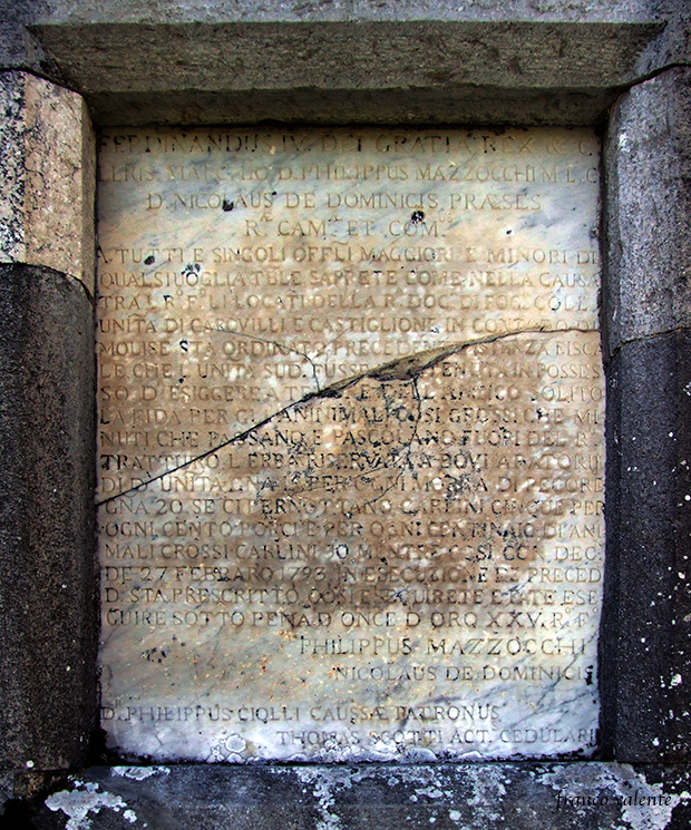 Ma a volte le chiese servono anche a ricordare cose terrene, perciò una lapide murata sulla parete esterna della chiesa ricorda, ormai inutilmente, che fu necessaria una sentenza del giudice Mazzocchi per ripristinare nel 1793, regnante Ferdinando IV di Borbone, il diritto che …alle Università di Carovilli e Castiglione fusse mantenuto il possesso d’esigere a tenore dell’antico solito la fida per gli animali così grossi che minuti che passano e pascolano fuori del Regio Tratturo l’erba riservata a bovi aratori di detta Università…”.