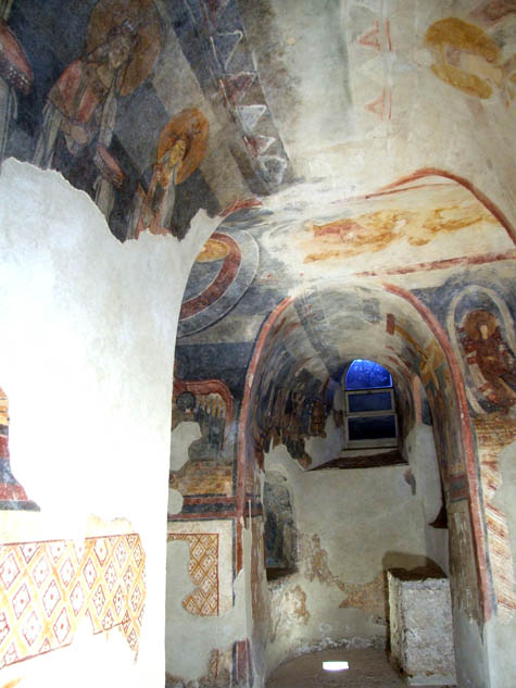 Maria Assunta in Cielo rovinato ma si riconoscono vistosi orecchini penduli ed una ricercata acconciatura nei capelli tenuti molto alti, parzialmente raccolti in un velo che scende alle spalle. E’ vestita con una grande dalmatica rossastra con una larga orlatura dorata che nella parte centrale forma un clavo. Dalle larghe maniche bianche spuntano gli avambracci fasciati dalla stoffa preziosa della tunica ocra che spunta anche sulla parte bassa della veste a coprire parte dei piedi calzati da pantofole regali arricchite da fili di perle. La mano destra è decisamente aperta con le dita allargate ed il palmo rivolto verso chi guarda, mentre la sinistra regge un grande libro aperto poggiato sulle gambe e le cui pagine riportano a grandi lettere la scritta BEATAM ME DICENT. Nella posizione della mano destra, nella scritta del libro e nell’atteggiamento regale della Madonna va cercata la chiave di lettura della composizione e si possono desumere i significati della sua presenza nella sfera celeste. L’evangelista Luca, che peraltro nella tradizione bizantina viene considerato colui che per primo abbia eseguito un ritratto della Madonna, racconta nei versetti del Magnificat l’incontro tra Maria ancora incinta e la cugina Elisabetta. Nella versione latina la Madre di Dio dice: Ecce enim ex hoc beatam me dicent omnes generationes. Tuttavia, è evidente che il versetto non si colleghi solamente allo stato fisico raffigurato; infatti, la Madonna non appare incinta e quindi la frase riportata sul libro aperto serve ad evocare un rapporto che è significativo per la sostanza e non per la forma: Gesù Cristo, che è Dio, è figlio di Maria. Un rapporto che tende ad esaltare il ruolo determinante di Maria nella storia della salvezza dell’umanità e che Autperto aveva ben evidenziato in una sua originale omelia In festo Assumptionis. Per il fatto di essere la Madre di Dio, la Madonna è la Regina dell’Universo e come tale esercita il potere su tutte le cose assisa su un trono al centro della sfera celeste. E la mano rivolta verso chi la guarda, con il palmo vistosamente aperto per la esagerata snellezza delle lunghe dita, sembra raccogliere la potenza che è insita nel suo ventre per emanarla verso l’esterno. Una mano che non è certamente segno di sbigottimento come quella che vedremo più avanti nella raffigurazione del momento in cui riceve l’annunzio dall’angelo Gabriele, ma che è l’espressione della consapevolezza della sua decisiva partecipazione agli avvenimenti della grande vicenda umana nei suoi rapporti con il Divino. Una volta definiti i significati della singola immagine, risulta chiaro il suo ruolo nel contesto pittorico rappresentato. La Madonna Regina si afferma in tal modo come elemento determinante e non eliminabile di un processo che, pur essendo fuori del tempo terreno, è costituito da vari momenti che si identificano nelle figurazioni tutte correlate tra loro. In termini più semplificati possiamo riconoscere una serie di composizioni significative tutte legate tra loro in una sorta di spirale senza fine che parte dalla rappresentazione della Terra che, priva di montagne, vaga in uno spazio siderale sorretto dalla fissa staticità dei quattro Arcangeli posti ai quattro punti cardinali. Al centro della calotta celeste, contornata di stelle, la Madonna Regina sprigiona un potere su tutto l’Universo e quindi anche sul quinto Arcangelo che, per il fatto di reggere il Sigillo del Dio Vivente, rappresenta suo Figlio. A sua volta l’Angelo-Cristo esercita il potere sugli altri quattro Arcangeli che, raccolte le stelle cadute, le tengono in una sfera per impedire la formazione dei venti e prepararsi all’apertura del Settimo Sigillo. CRISTO DELL’APOCALISSE Dalla zona absidale ora ci spostiamo di nuovo nel braccio lungo, ma sulla parete opposta dove sono rappresentati i momenti significativi della vita di Gesù e Maria. Al centro della volta, in alto, sopravvivono deboli segni del Cristo dell’Apocalisse. I colori superstiti, il giallo e l’ocra, insieme alle sottili incisioni provocate dalle punte dei compassi usati dal pittore sull’intonaco ancora fresco, aiutano a ricostruire l’immagine originale dove si vede il Cristo seduto su una grande sfera con i piedi che poggiano su una seconda sfera, più piccola, che si incastra nella parte bassa della prima. La lunga tunica sembra trattenuta sulle ginocchia dalla mano sinistra dove una volta si vedeva un libro aperto rivolto verso l’osservatore, il libro della Rivelazione, mentre pochissimo rimane della destra in atteggiamento benedicente. Della testa rimangono solo i lunghi capelli che, raccolti sulla nuca, scendono fin sulle spalle. Grandissima è l’aureola dorata crucisegnata e contornata da una larga fascia più chiara. Alle considerazioni fatte prima, sulla posizione del Cristo nella fascia di luce che squarcia le nuvole, si deve aggiungere quella della contemporanea assialità trasversale con la Madonna Regina e la scena dell’Annunciazione, evidenziando così la doppia natura, divina ed umana. Quella divina, come già visto, è simboleggiata nell’essere posto nella luce di Dio. Quella umana è sottolineata dall’essere posto anche sull’asse trasversale, tra sua Madre Regina assisa nella magnificenza del creato e sua Madre spaventata dall’arrivo dell’Angelo Gabriele. Apparentemente è scomoda, per chi osserva, la visione del Cristo e questa circostanza ci aiuta a comprendere (come si vedrà dopo) che il punto di osservazione ottimale non è quello del visitatore occasionale della cripta L’ANNUNCIAZIONE Anche la lettura delle figurazioni poste sulle pareti non può seguire un criterio puramente pratico per il fatto che, apparentemente, non vi è conseguenzialità temporale tra gli avvenimenti narrati e la sequenza visiva. Proprio di fronte alla cavità dell’abside, in asse architettonico, si sviluppa il braccio corto della cripta che, nella parte centrale, si conclude in alto in forma semic