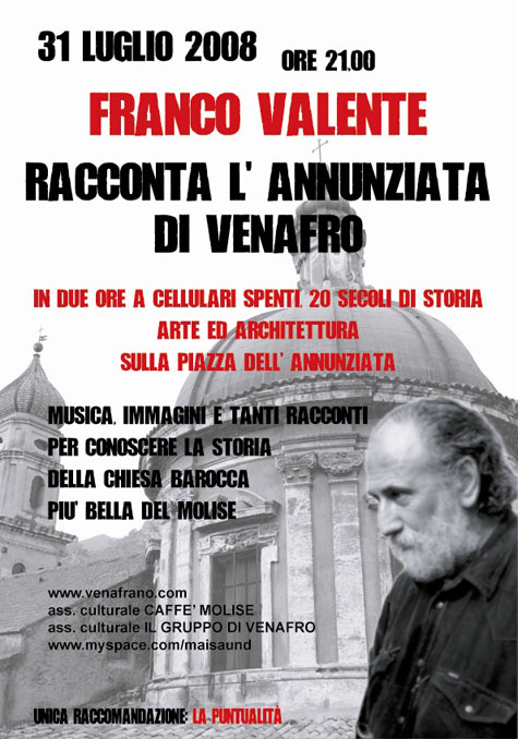 Oltre settecento persone sono rimaste prese, per oltre due ore, dai racconti e dagli aneddoti del noto architetto, sulla storia della chiesa e della nostra città. Lui da solo, di fronte al pubblico e con le spalle rivolte alla chiesa Annunziata, le cui porte erano spalancate. Una magia irripetibile. Fatta di arte, architettura, storia, umanità. A testimoniare che i venafrani hanno fame e sete di cultura. E di conoscenza. Inoltre è stato sfatato il mito dell’emigrazione verso l’esterno, perchè alla conferenza di Franco sono venuti da fuori. Da Isernia, Campobasso ed Agnone. Va dato atto e merito alla Pro Loco ed al suo presidente Francesco Martino di averci creduto e di aver vinto una scommessa difficile. Che tutti ritenevano persa in partenza. Da segnalare la totale assenza dei nostri politici. Intimoriti forse da quello che avrebbe potuto denunciare l’arch. Valente, il quale però si è limitato ad una conferenza strettamente culturale. Senza alcun riferimento amministrativo e politico.