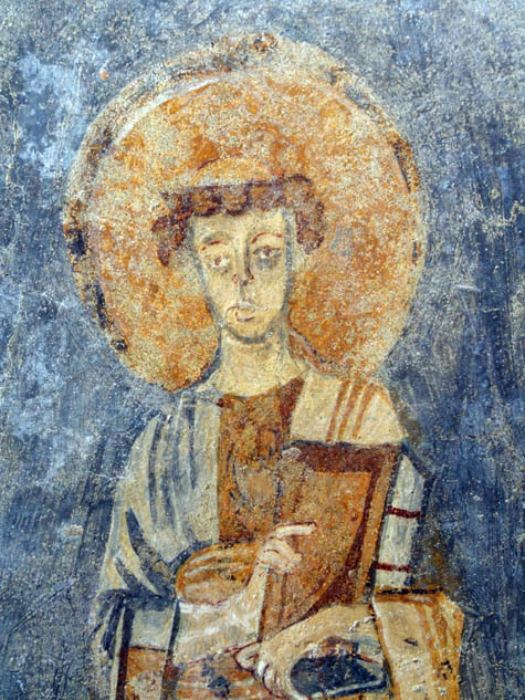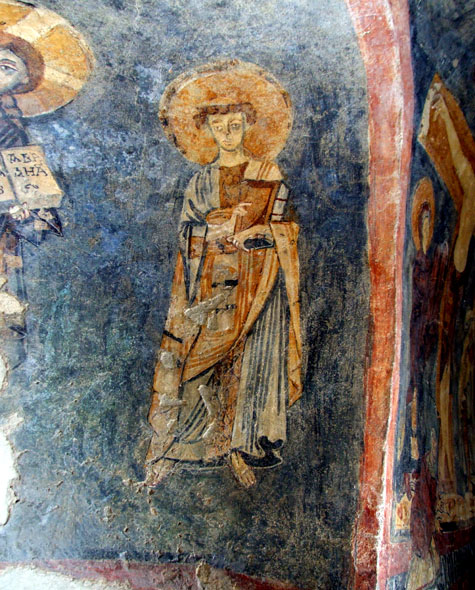 Sebbene non vi sia alcuna epigrafe, la figura di S. Stefano protomartire che si riconosce per avere nella mano sinistra un sasso che allude al suo martirio mediante lapidazione. Ha il capo tonsurato ed è vestito di una lunga tunica verde dal colletto e dai polsini dorati. E’ una tunica diversa da quella che in genere si usa per gli apostoli per essere priva di cordone e di mantello ed è tipica dei santi protomartiri Stefano e Lorenzo.