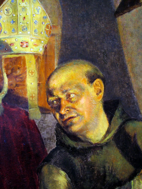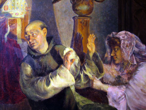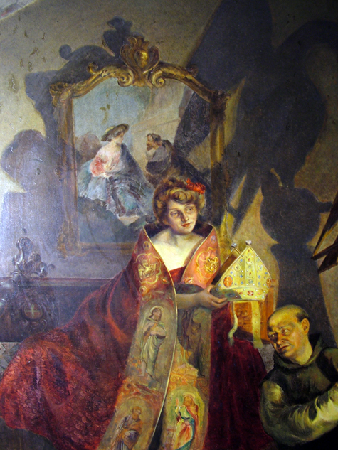 La donna regge nelle mani una mitra vescovile nell’atto di metterla sul capo del monaco.