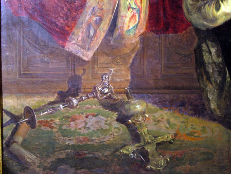 A terra un grande tappeto a fiori sul quale stanno i pezzi di un candeliere barocco e una croce astile dai bracci polilobati.