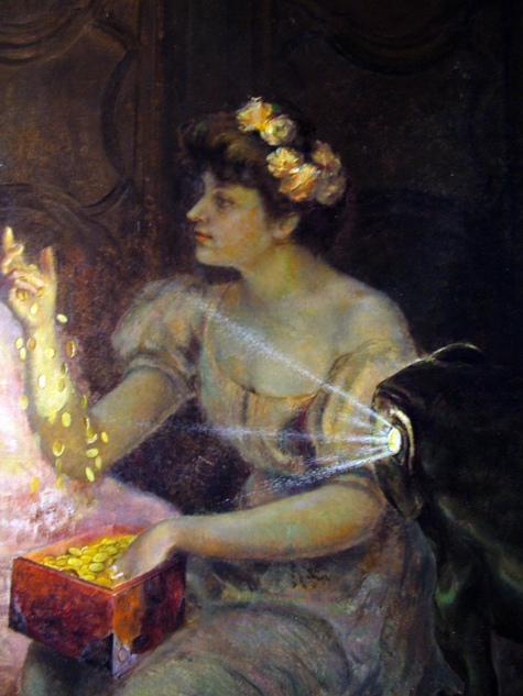 La seconda, con una veste dall’ampia scollatura, fa brillare un pugno di monete d’oro che lascia cadere all’interno di un cofanetto che ne è pieno.
