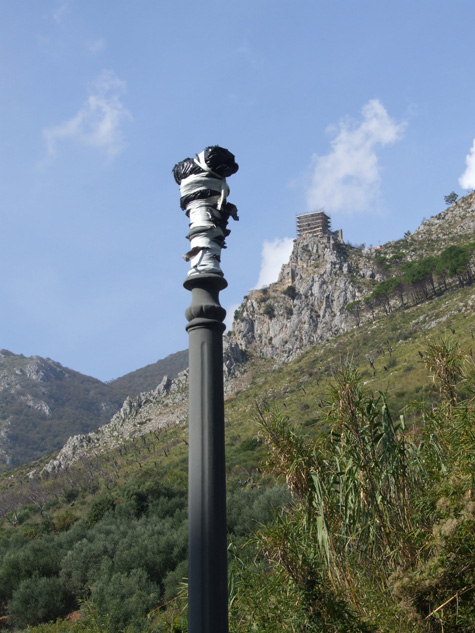 Dall’immagine si vede che, quando un lampione deve essere riparato, si elimina la parte luminosa, si fa un cappuccio con un sacco per l’immondizia e si avvolge con il nastro isolante.