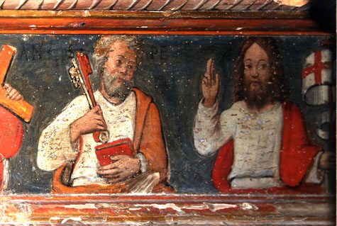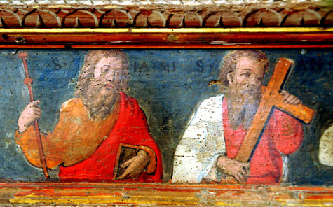 S. Giacomo è rappresentato con il bastone di pellegrino e S. Andrea con la croce del suo martirio