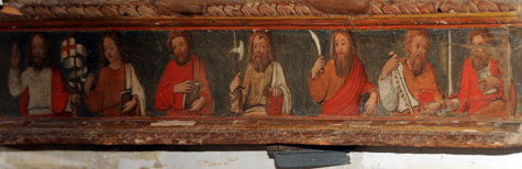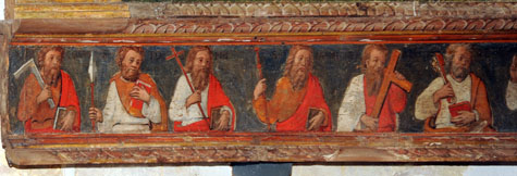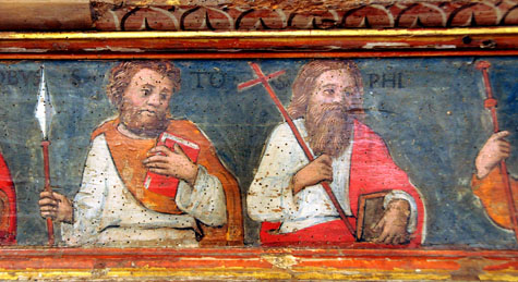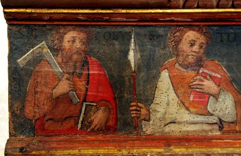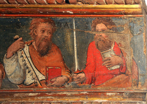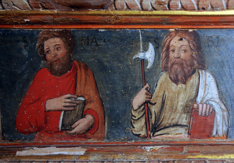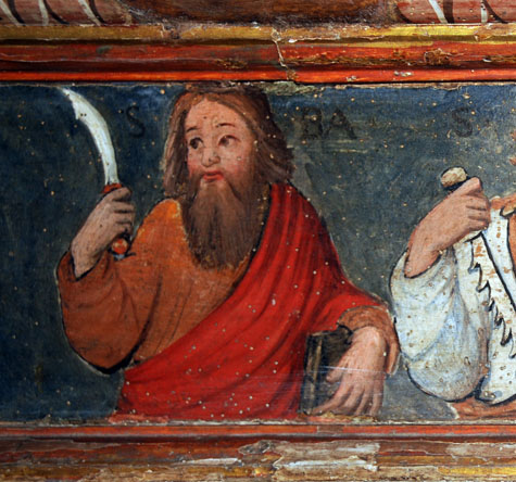S. Bartolomeo è raffigurato con il coltello che ricorda che fu scuoiato. A lato Giuda Taddeo regge la sega col la quale fu martirizzato insieme a Simone lo Zelota. A lato è S. Paolo con la spada che simboleggia la sua lingua tagliente.