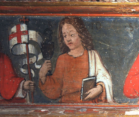 Il pittore evidentemente non aveva una particolare preparazione agiografica perché nel rappresentare S. Giacomo mette nella sua mano uno squadro che, notoriamente, è l’attributo di S. Tommaso.