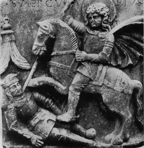 Era Mercurio un soldato che Giuliano aveva fatto uccidere per la sua fede e che era stato sepolto proprio in quella chiesa. Subito si presentò S. Mercurio con tutte le sue armi e si preparò a combattere in ubbidienza alla Vergine.