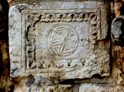 Una è sistemata ai lati del capitello della colonna fitomorfica sostenuta dal grifone nella facciata della cattedrale di Larino, sulla sinistra. E’ costituita da un blocco squadrato in cui una faccia reca un rettangolo con una pronunciata cornice a fettuccia. Al centro è un cerchio nel quale è inscritto un esalfa con i sei lati e i sei raggi in forma di foglie lanceolate. Sembra provenire da un altro edificio da cui è stata etratta per essere riutilizzata soprattutto per il segno che contiene.
