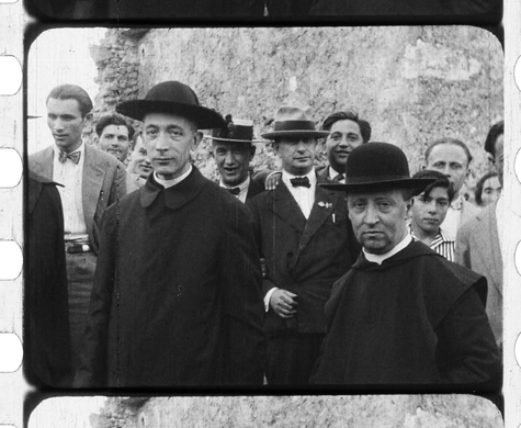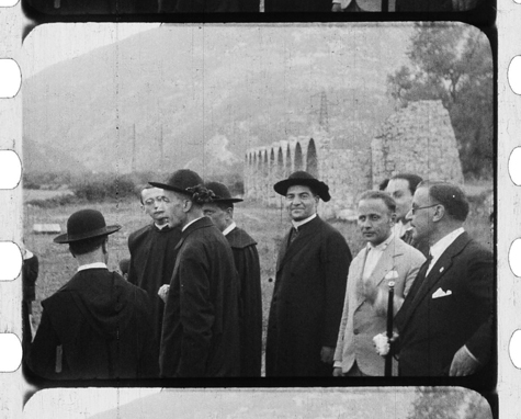 Le immagini mostrano lo stato dell’edificio abbaziale nel quale Schuster entrò per una visita generale accompagnato da cittadini e autorità del luogo. Nell’immagine si vede Schuster che insieme agli altri scende dallo scalone, ancora esistente, che collega il salone (oggi sala della Biblioteca) all’androne catalano dei Pandone.