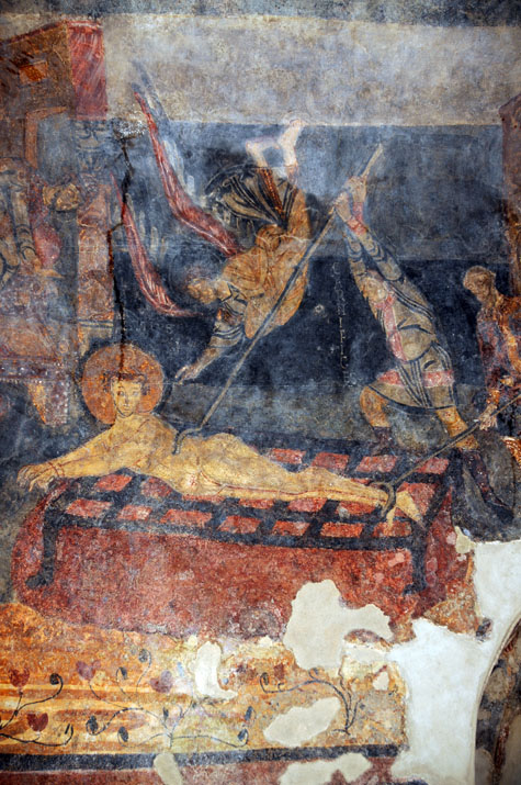 La scritta verticale, carnifices, sembra tratta dal carme damasiano in onore di S. Lorenzo: verbera carnifices flammas tormenta catenas vincere Laurenti sola fides potuit.