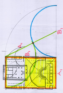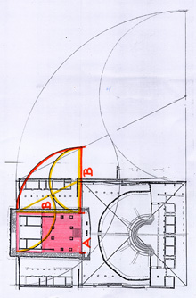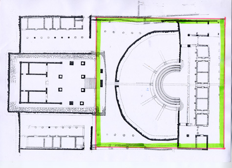 Pianta del complesso tempio-teatro – Il quadrato in verde misura esattamente 200 piedi di lato (ducentos maxime pedes in omnes pariter partes), pari a 55 metri