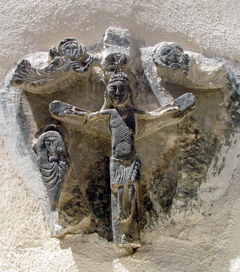 Il tema dell’angelo che scende dall’alto verso Cristo in croce è abbastanza frequente nel basso medioevo soprattutto nelle croci astili sulmonesi. La sua funzione è stata diversamente interpretata perché l’angelo a volte viene visto come una sorta di soccorritore di Cristo nel momento più alto della sua passione, altre volte viene considerato come simbolo della sua glorificazione.